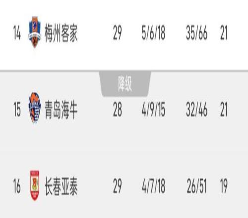 目前长春亚泰完赛29轮积19分垫底,梅州客家完赛29轮积21分排名倒三、因胜负关系暂离降级区,而青岛海牛完赛28轮积21分暂列倒二。